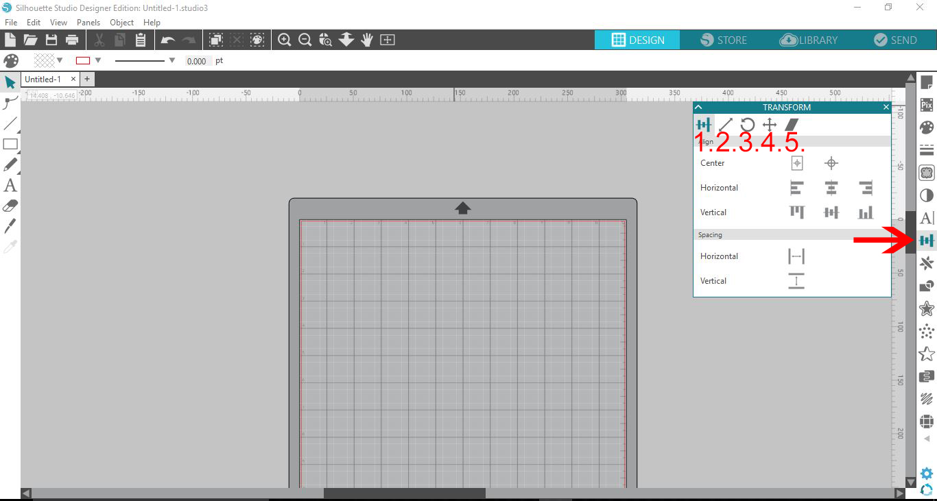 8- Transform. This now includes several other icons from the previous V3 software. Align (1), Scale (2), Rotate (3), Move by (4) horizontal shear (5).