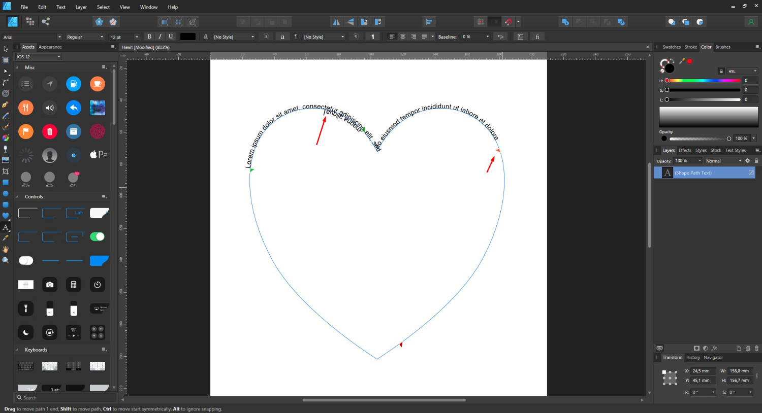 Then you can start typing. As you can see, when converting to a text path, the placement of text starts in the top center of the heart.