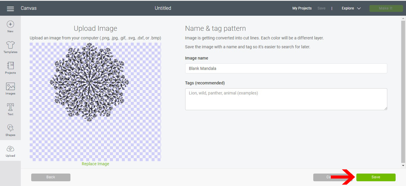 1- Open Cricut Design Space. Click on new project.2- In design space, click on shapes.3- Select your shape. a square is great to create a border.4- add a square to your design space. Next click on image.5- In the design space images, use the search bar ...