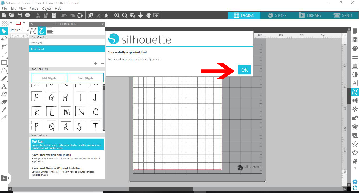 Once you click on Test Run, a popup box will appear and let you know that the font has been uploaded.