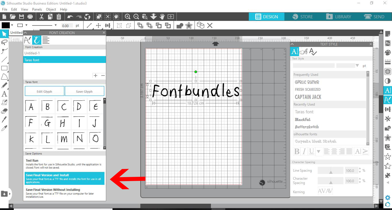 Now, go to the Text Style panel on the right hand side and locate your uploaded font. We have a great tutorial on using fonts in Silhouette Studio if needed. Click on the font to select it.