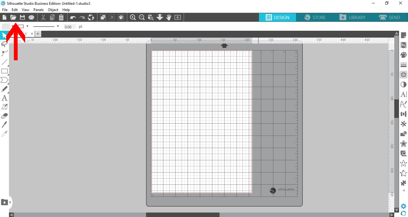 Open Silhouette Studio, then open your file. Do this either by clicking the File icon top toolbar or File > Open.