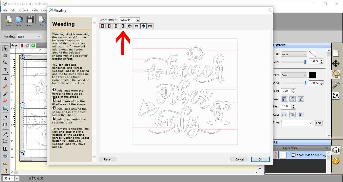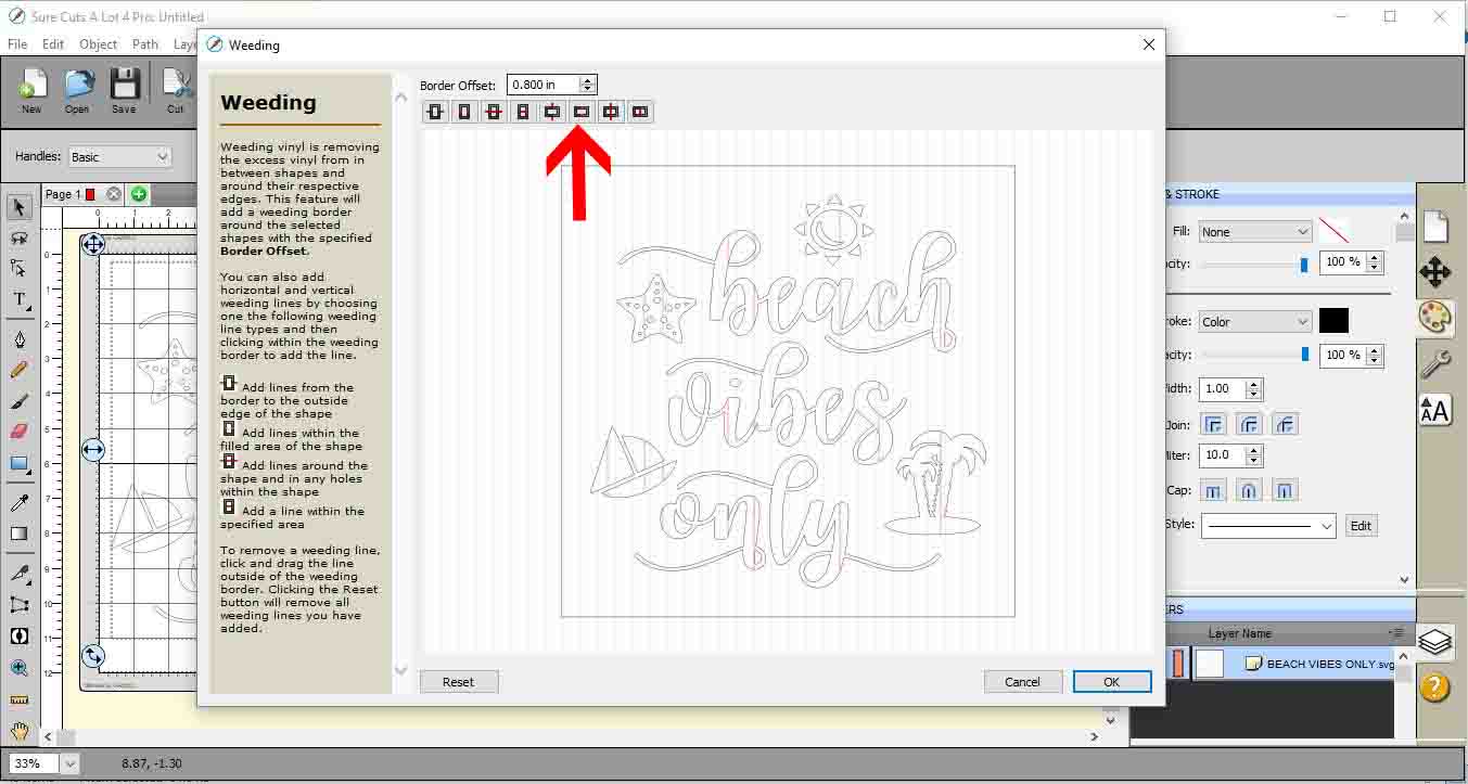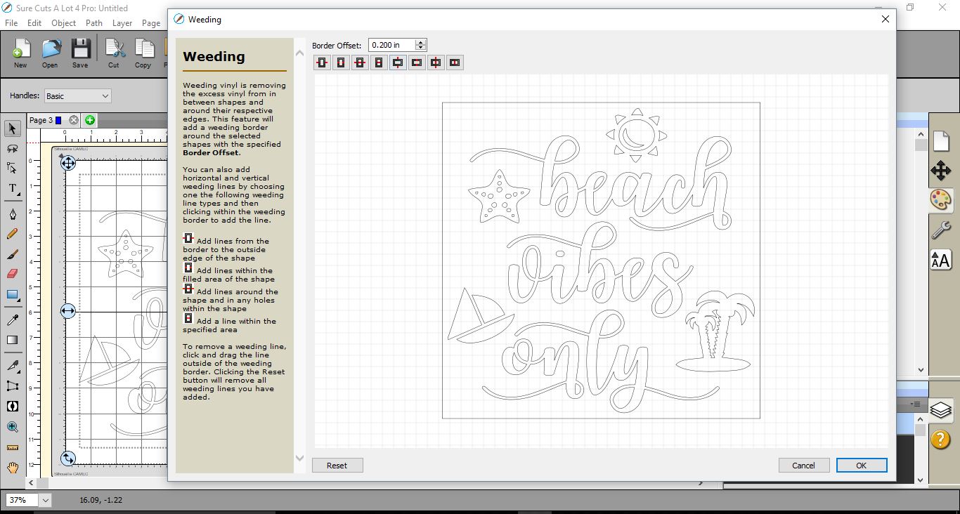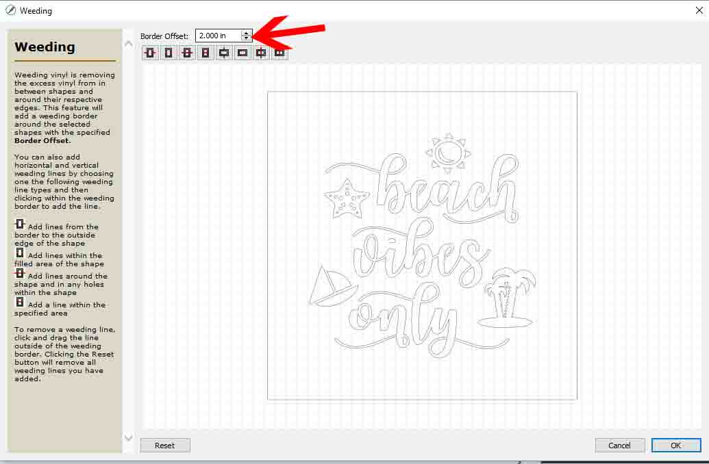 5- The first option you have is the border offset. you can adjust the amount of space you will have from the rectangle around your design when placing weed lines.