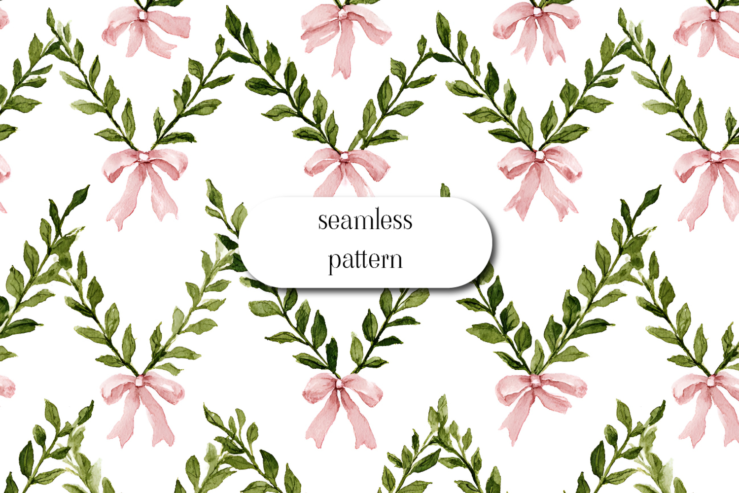 Watercolor Greenery Garland Pattern with Pink Bows example image 1