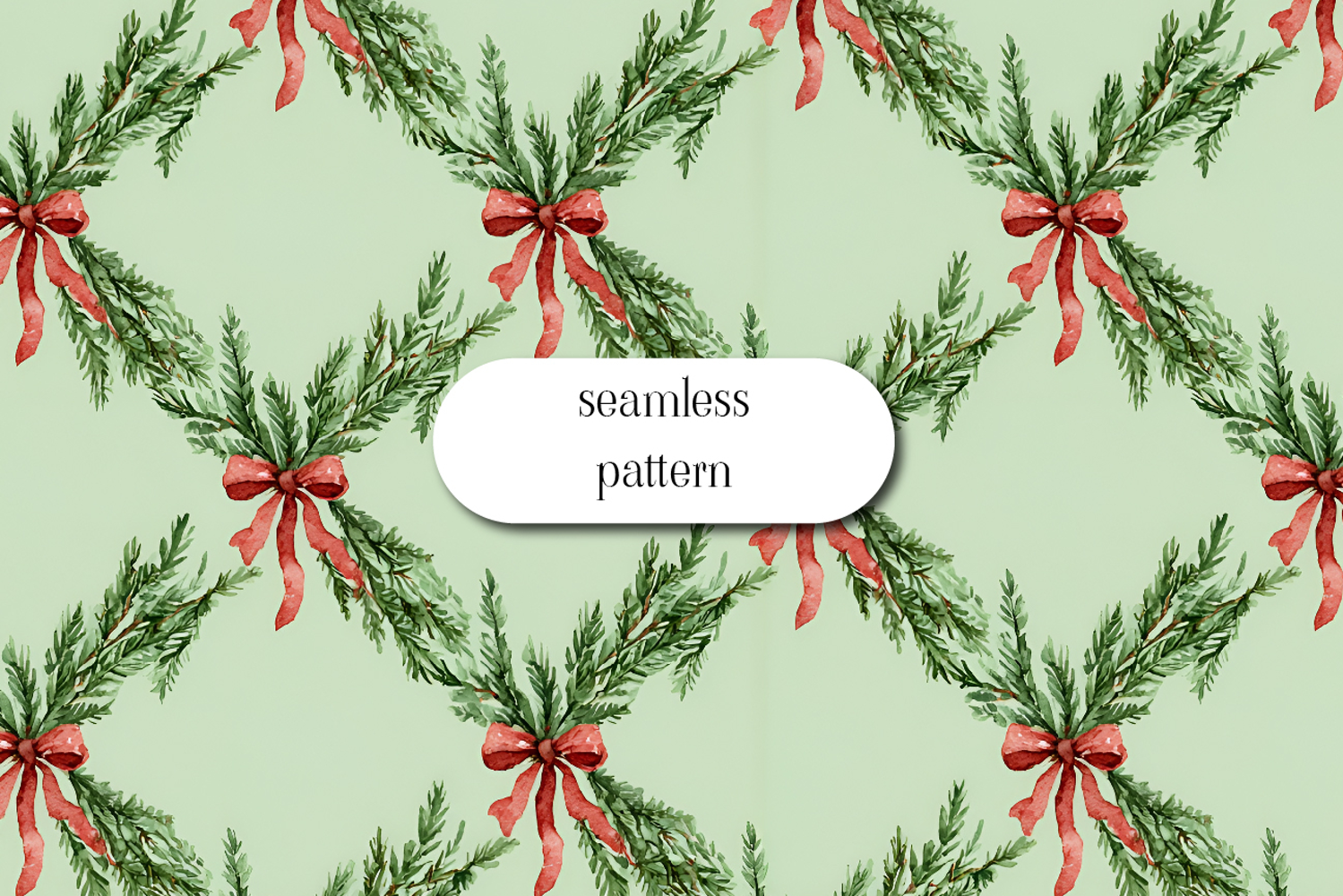 Watercolor Pine Garland Pattern with Red Ribbon Bows example image 1