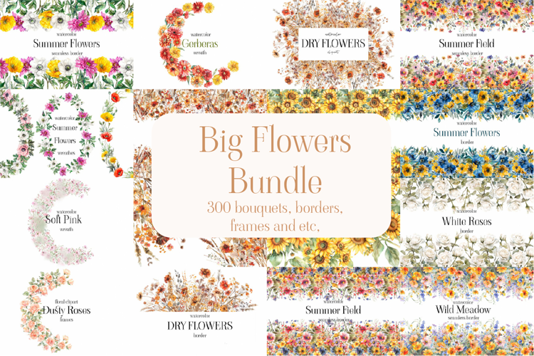 Bring your creative projects to life with this Big Flowers Bundle, featuring 300 beautifully watercolor floral elements. This collection includes an extensive variety of bouquets, borders, frames, wreaths, and seamless patterns inspired by wildflowers, sunflowers, roses, spring blossoms, and autumn fields.