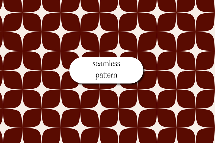 This seamless pattern features a bold retro geometric tile design in deep burgundy on a soft cream background. Its mid-century modern aesthetic makes it perfect for fabric printing, wallpapers, wrapping paper, digital scrapbooking, and home décor projects. The curved, symmetrical shapes create a stylish and timeless repeating pattern suitable for both vintage and contemporary designs.