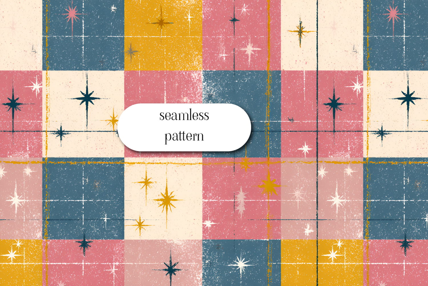 This retro-inspired seamless pattern features bold mid-century color blocks in mustard yellow, navy blue, and vintage pink, accented with classic atomic starbursts and textured linen-style details. The distressed overlay adds a nostalgic, hand-crafted charm reminiscent of 1950s and 1960s design. Perfect for scrapbooking, sublimation, fabric printing, wrapping paper, digital backgrounds, retro home décor projects, and more. High-resolution and seamless for flawless repeating results.