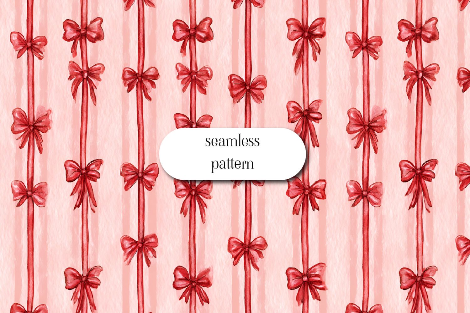 Watercolor Red Ribbon Bow Seamless Pattern on Pink example image 1