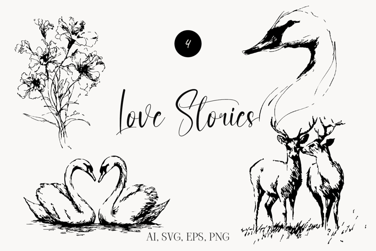 Romantic hand-drawn line art collection featuring flowers, swans, deer, and elegant love symbols. Perfect for wedding invitations, Valentine’s designs, branding, stationery, scrapbooking, and romantic creative projects. Delivered in high-quality AI, SVG, EPS, and PNG formats for easy use and customization.