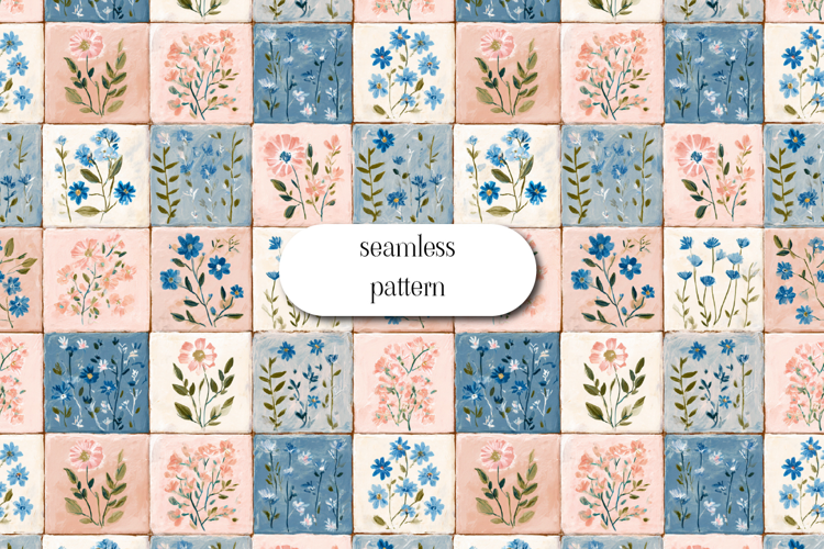 Soft hand-painted seamless floral tile pattern featuring delicate blue and blush pink flowers arranged in a charming square grid. Inspired by vintage ceramic tiles and cottagecore aesthetics, this botanical design has a painterly texture and gentle pastel palette. Perfect for fabric printing, wallpaper, stationery, wrapping paper, scrapbooking, home decor, and surface pattern design projects. Seamless repeat for easy scaling and professional print results.