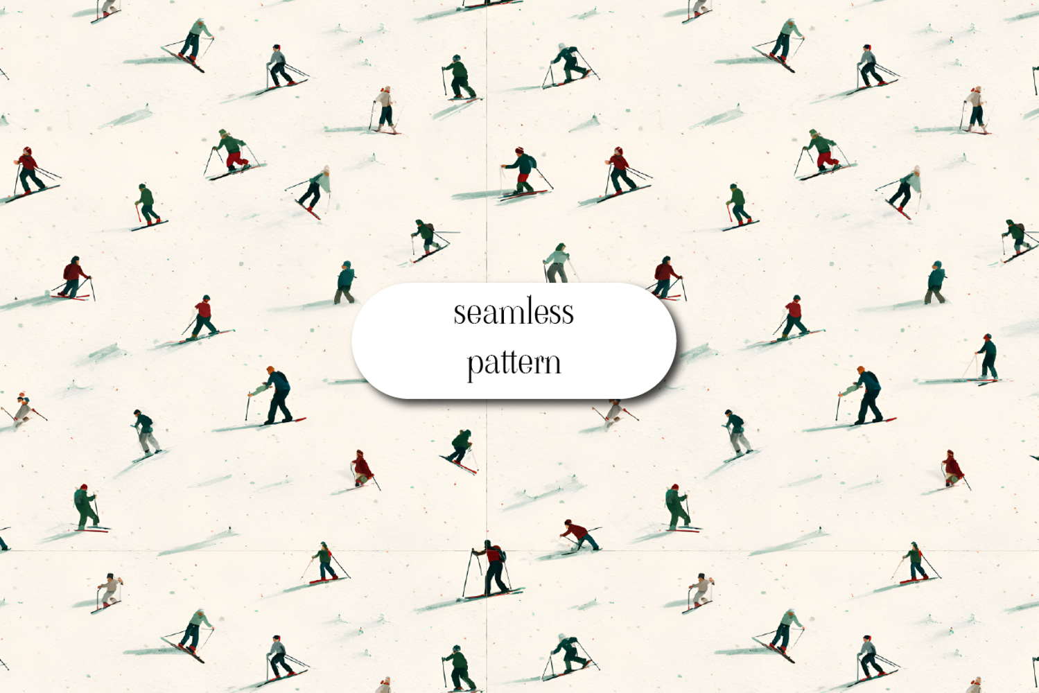 Charming seamless winter pattern featuring hand-painted skiers scattered across a snowy background. This design captures a nostalgic, vintage winter sports vibe with soft textures and muted colors. Ideal for fabric printing, gift wrap, wallpaper, stationery, apparel, winter-themed decor, and surface pattern design projects. The seamless repeat makes it easy to scale for both small and large applications while keeping a cohesive look.