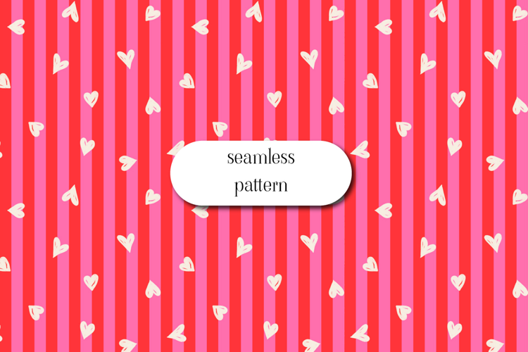 This seamless Valentine’s Day pattern features playful hand-drawn white hearts scattered over bold pink and red vertical stripes. The fun, romantic design is perfect for love-themed and festive creative projects.