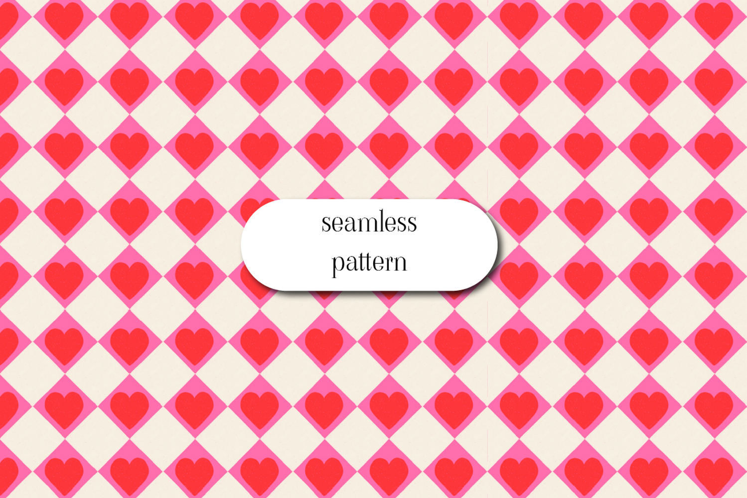 This seamless Valentine pattern features repeating red hearts set inside a pink argyle diamond layout on a soft cream background. The playful geometric design combines classic argyle style with a romantic, love-themed twist.