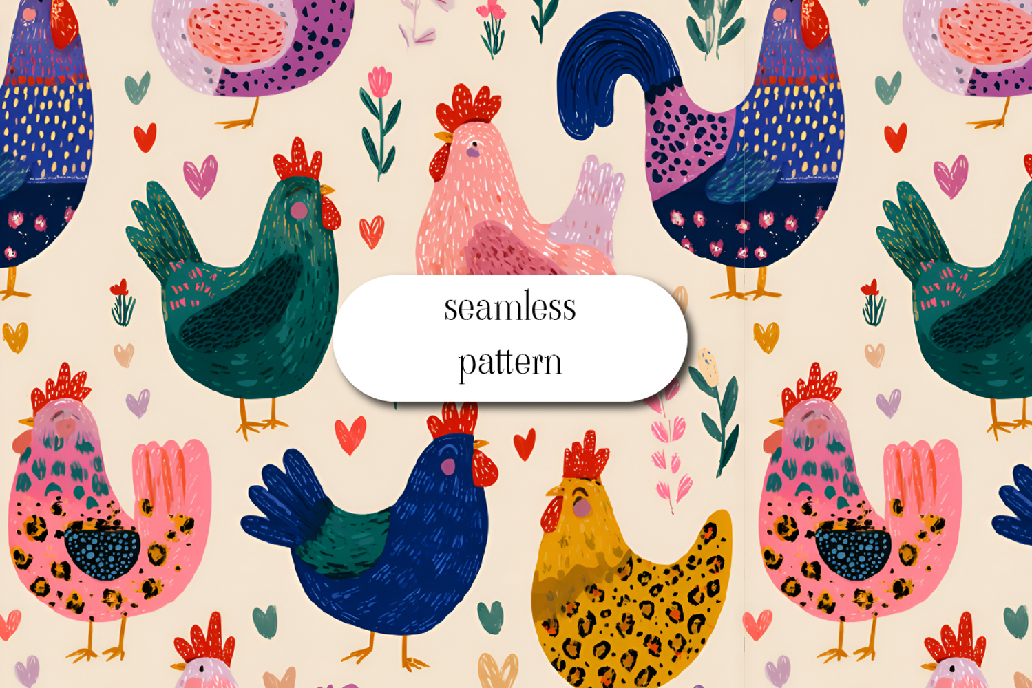 Playful seamless pattern featuring hand-painted chickens in soft, cheerful colors. Whimsical hens with textured brushstrokes are paired with simple leafy accents on a warm neutral background. Perfect for farmhouse décor, kids designs, fabric, wallpaper, wrapping paper, stationery, and nursery projects. High-quality repeating pattern ideal for print and digital use.