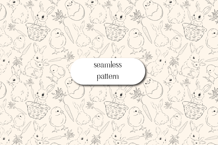 Featuring delicate line art illustrations of bunnies, chicks, carrots, and Easter eggs, this pattern has a gentle vintage feel that works beautifully for nursery and spring-themed projects.