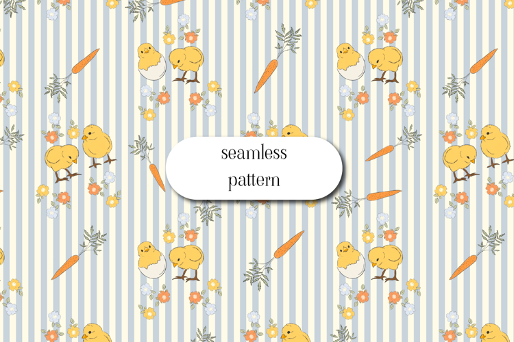 This seamless Easter pattern features adorable yellow chicks, carrots, and delicate spring flowers on a soft blue striped background. Designed in a charming vintage nursery style, it’s perfect for Easter crafts, baby products, fabric printing, scrapbooking, and digital design projects.
