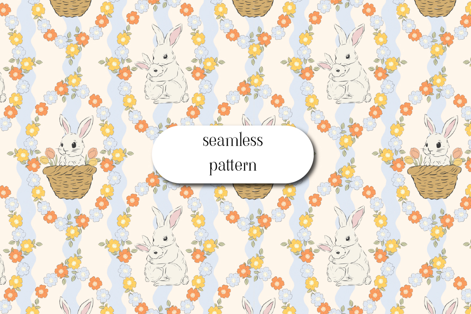 A charming seamless Easter pattern featuring hand-drawn bunnies, wicker baskets, and soft spring florals arranged with gentle wavy stripes. The pastel color palette and vintage nursery style make this design perfect for baby, Easter, and spring-themed projects.
