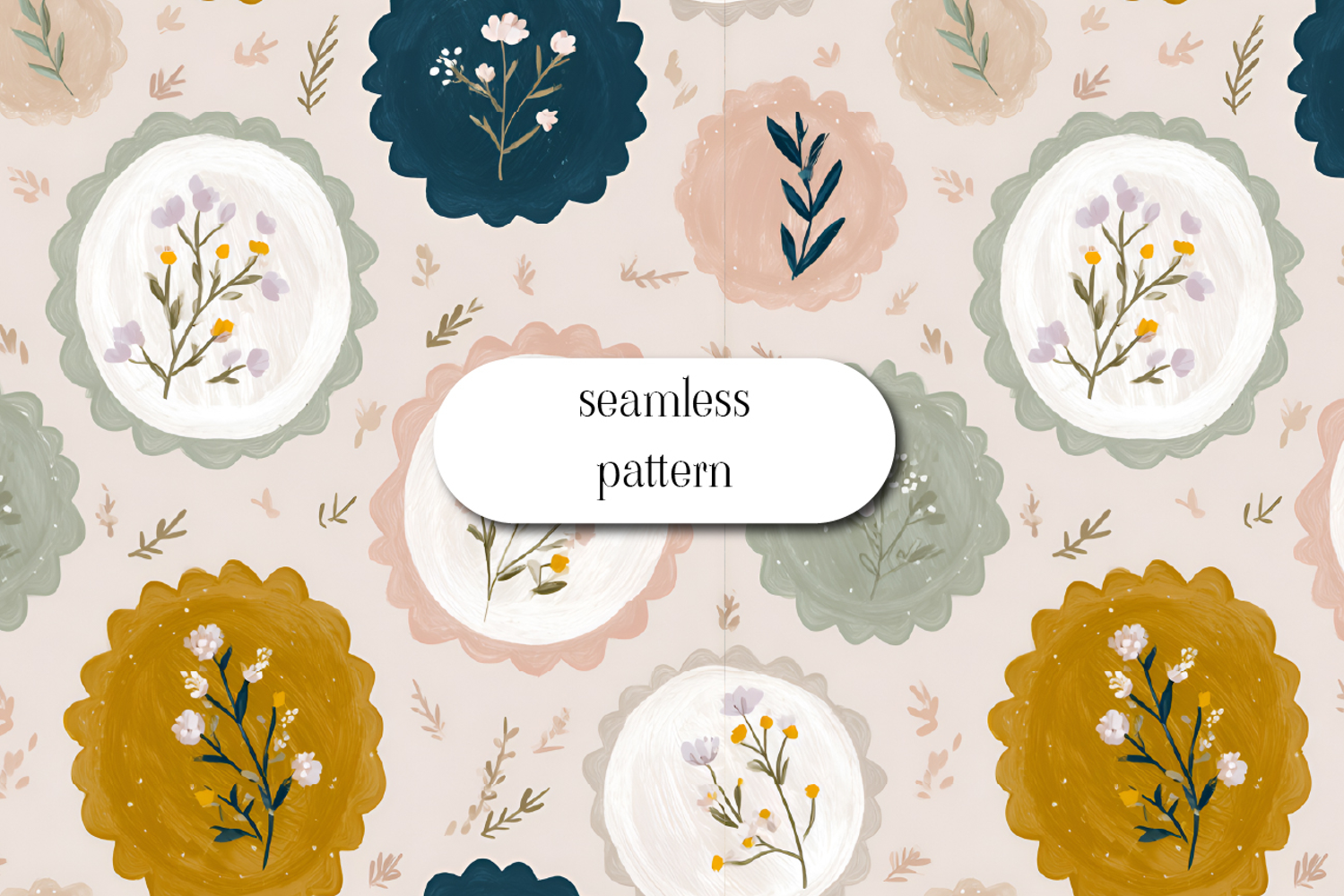 This seamless floral pattern features delicate wildflower sprigs framed inside hand-painted medallions in soft neutral tones. Muted sage, blush, cream, mustard, and deep blue accents create a calm, modern cottagecore aesthetic with a gentle painterly texture.