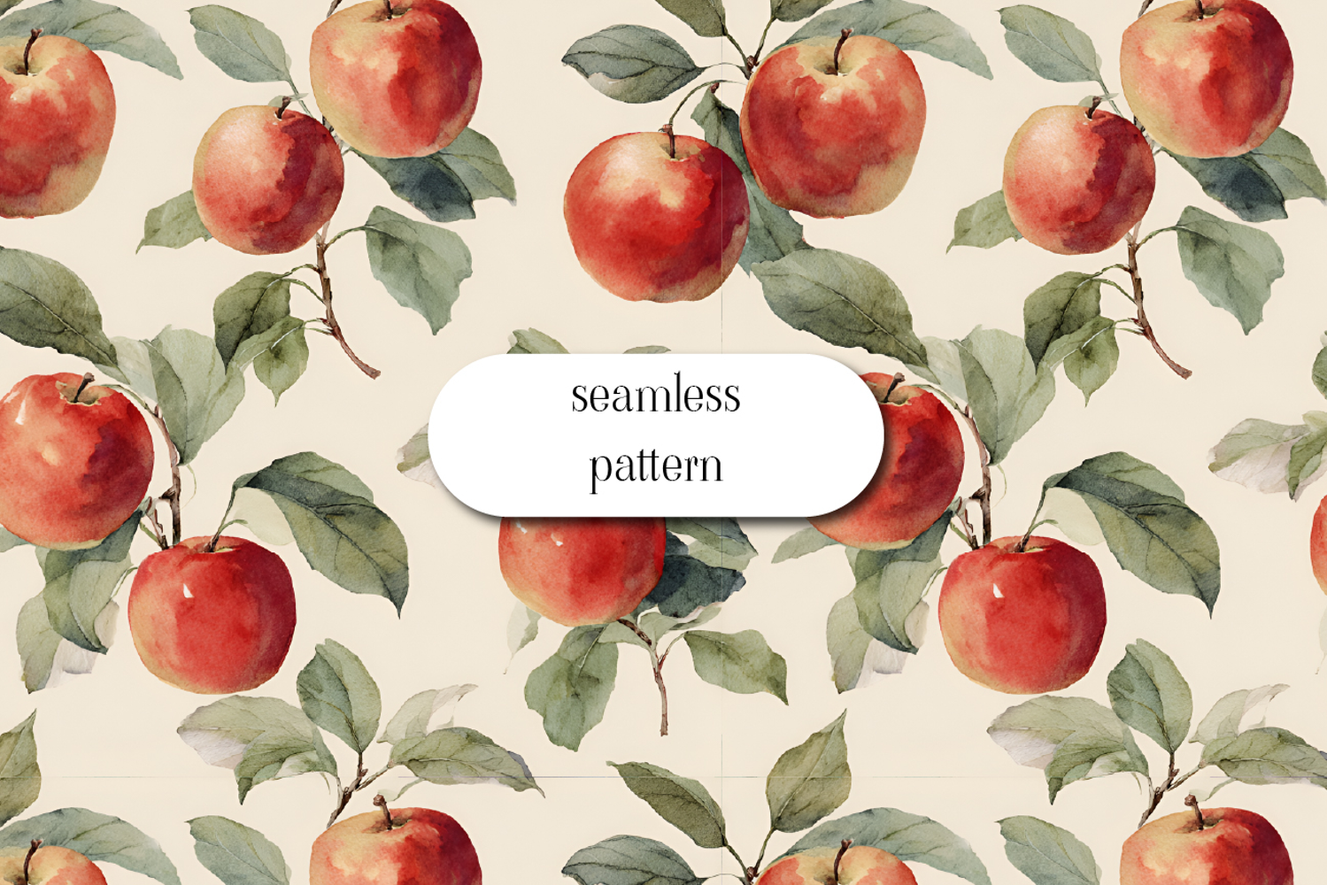 Hand-painted watercolor apple seamless pattern featuring ripe red apples and soft green leaves on a warm cream background. This timeless botanical fruit design is ideal for fabric, wallpaper, kitchen decor, packaging, stationery, and surface pattern design. Seamless and ready for print or digital use.