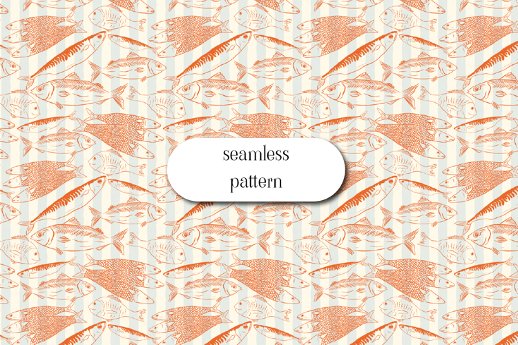 Seamless nautical pattern featuring detailed hand-drawn fish in vibrant coral tones layered over soft blue and cream vertical stripes. Inspired by coastal markets and Mediterranean seaside living, this design combines marine life illustrations with a fresh striped background. Perfect for fabric, wallpaper, kitchen decor, seafood branding, gift wrap, and digital backgrounds. A bold yet elegant ocean-inspired pattern ideal for summer collections and beach-themed projects.