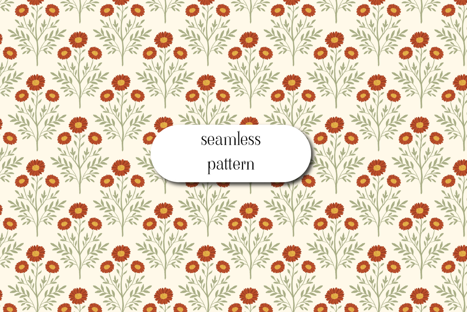 Charming seamless floral pattern featuring small vintage-style daisies with warm red petals and yellow centers surrounded by soft green leaves on a light neutral background. This delicate botanical repeat has a timeless cottage-inspired feel and works beautifully for fabric, wallpaper, wrapping paper, scrapbooking, stationery and surface pattern design projects. Perfect for retro floral collections and nature-inspired designs.