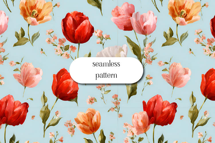 This floral repeat design is perfect for fabric printing, wallpaper, wrapping paper, stationery, scrapbooking, and other surface pattern projects. The graceful tulips and soft botanical elements make it ideal for cottagecore, vintage floral, and nature-inspired designs.