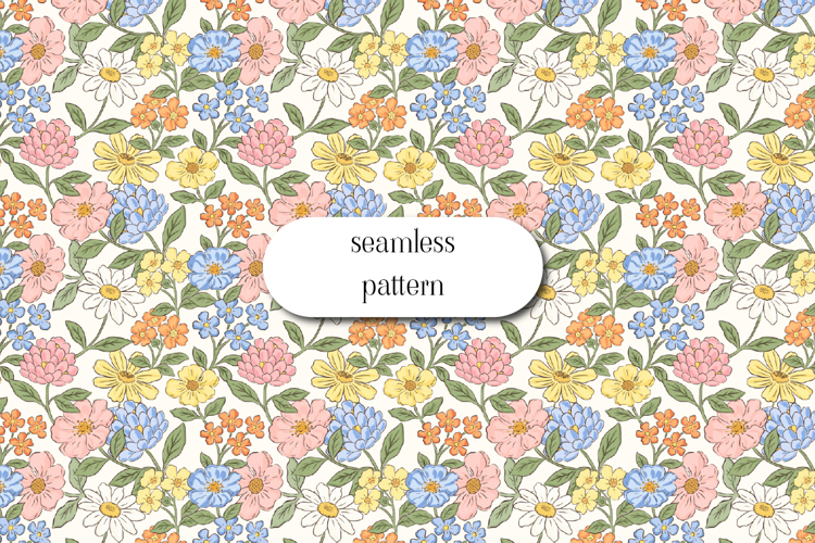 Charming seamless floral pattern featuring delicate wildflowers illustrated in a soft vintage style. This design includes a mix of pastel blossoms such as daisies, tiny blue flowers, yellow blooms, and pink florals arranged with leafy stems in a balanced repeating composition.