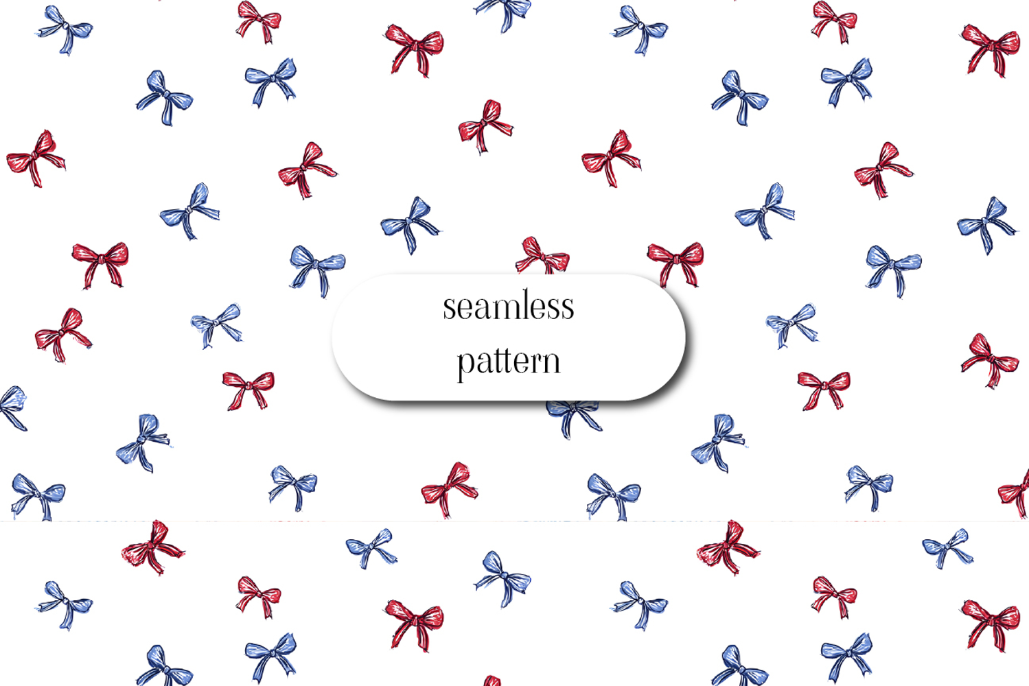 Charming seamless pattern featuring hand-drawn red and blue ribbon bows scattered across a clean neutral background. The sketch-style illustration gives a playful yet elegant feel, perfect for patriotic themes, gift wrap, fabric, and party decor. Ideal for Independence Day, Americana-inspired projects, and cute feminine designs. The repeating layout ensures a smooth, professional tiling for both digital and print use.