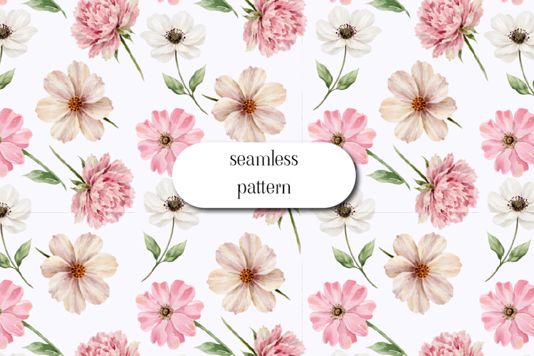 This delicate seamless pattern features soft watercolor flowers in gentle shades of pink, blush, cream, and white, accented with fresh green leaves. The airy arrangement and subtle textures create a romantic and elegant botanical design.