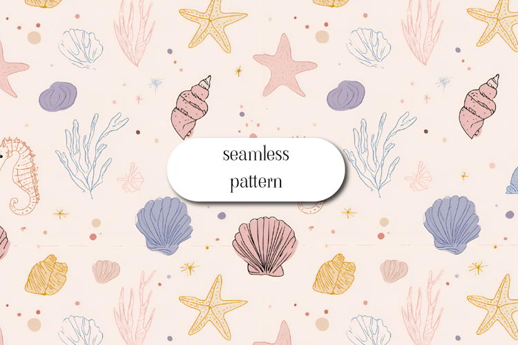 Soft and charming seamless pattern featuring hand-drawn seashells, starfish, coral and a cute seahorse in pastel tones. This delicate ocean-inspired design has a light, airy feel with minimal line art and subtle colors, perfect for beach-themed projects, fabric, nursery decor, stationery and summer designs.
