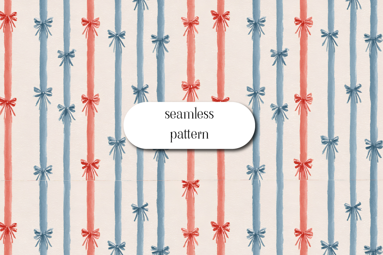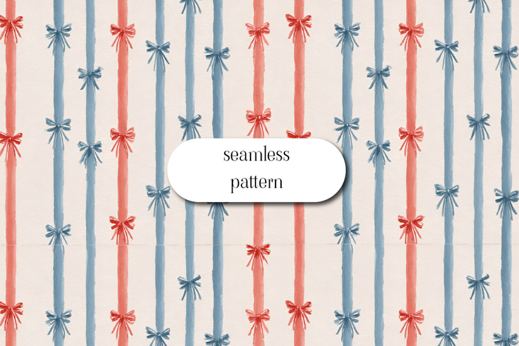 Elegant seamless pattern featuring watercolor ribbon bows placed over vertical red and blue stripes. The soft hand-painted texture and delicate bow details create a classic and slightly nautical aesthetic. Perfect for fabric, gift wrap, stationery, patriotic themes, and timeless decorative designs.