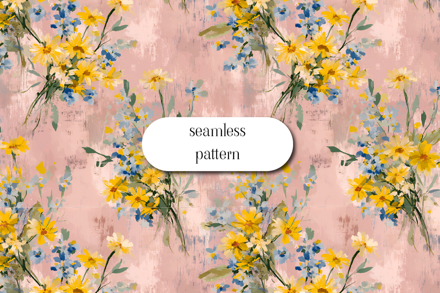 Beautiful seamless pattern featuring painterly yellow wildflowers with soft blue accents on a textured blush pink background. The expressive brushstroke style creates an artistic, modern floral design perfect for fabric, wallpaper, stationery, and surface pattern design projects. Ideal for spring collections, feminine branding, and elegant decorative prints.