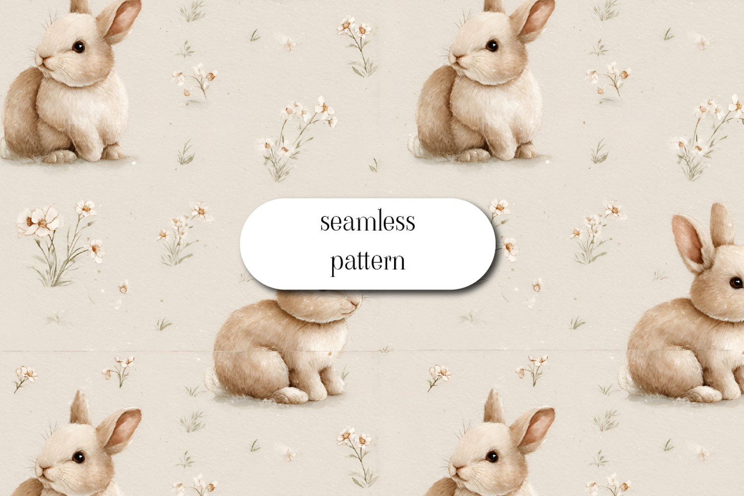 Adorable seamless pattern featuring soft watercolor bunnies surrounded by delicate wildflowers on a neutral beige background. This charming and gentle design has a cozy, nursery-inspired aesthetic, perfect for baby products, fabric, wallpaper, wrapping paper, and kids’ decor. Ideal for spring collections, woodland themes, and sweet, minimalist designs.