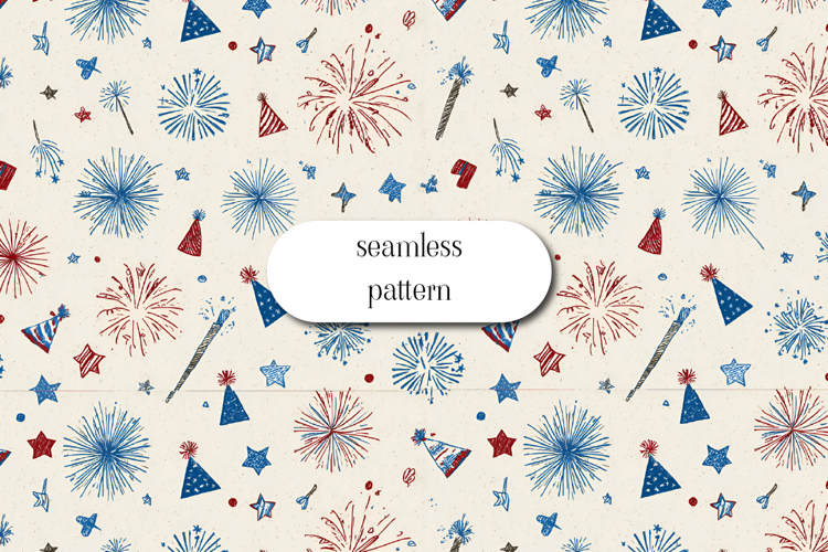 Fun and playful seamless pattern featuring hand-drawn fireworks, stars, and party elements in red and blue tones on a light background. This festive design captures a celebratory mood, perfect for Independence Day, holidays, party decor, wrapping paper, and themed fabric projects. The sketchy style adds a charming and creative touch.