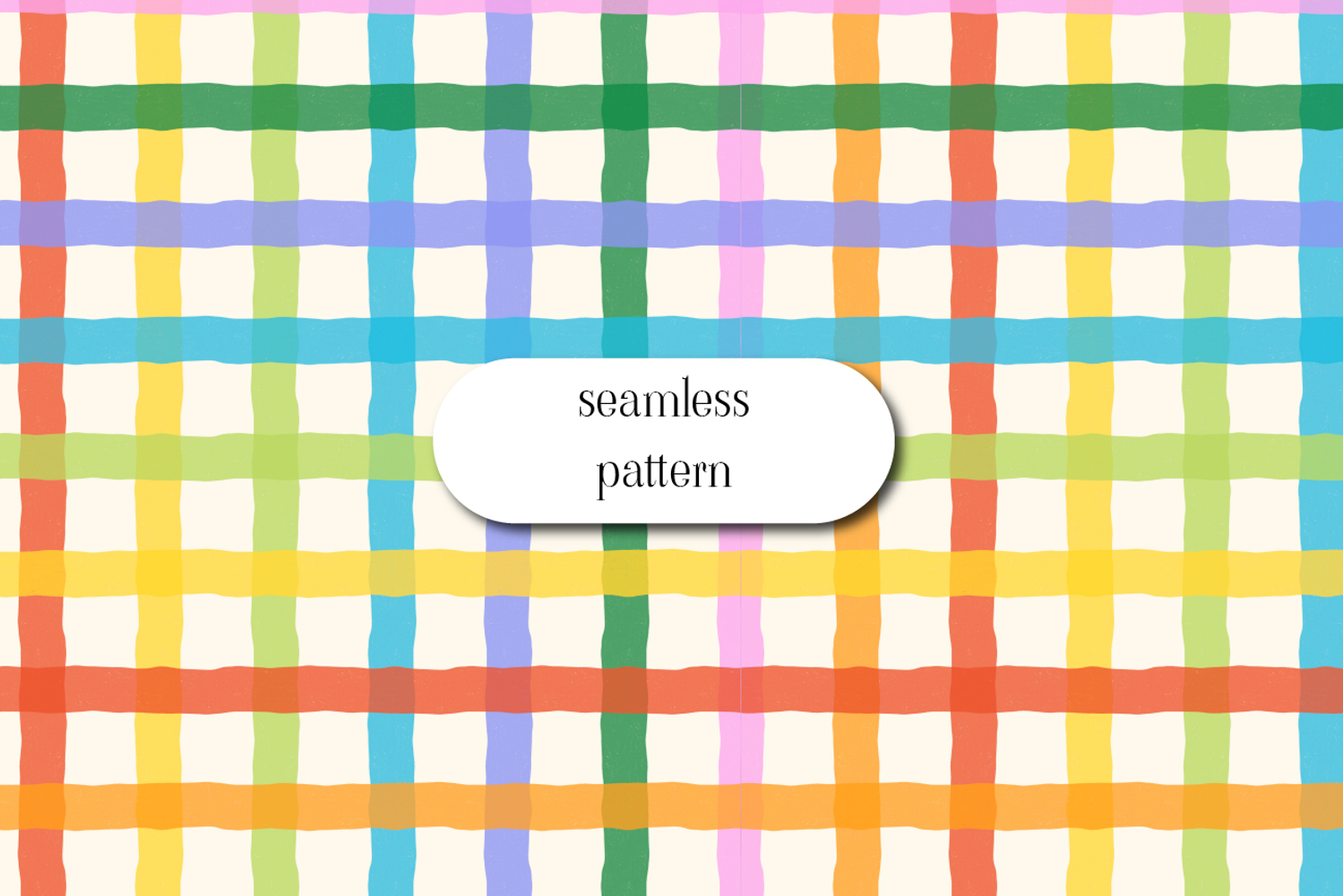 Colorful seamless plaid pattern featuring hand-drawn wavy stripes forming a soft checkered grid in vibrant rainbow hues. This playful and modern design is perfect for textiles, wrapping paper, stationery, kids products, and digital backgrounds. The organic lines and bright palette create a fun, cheerful, and contemporary look.