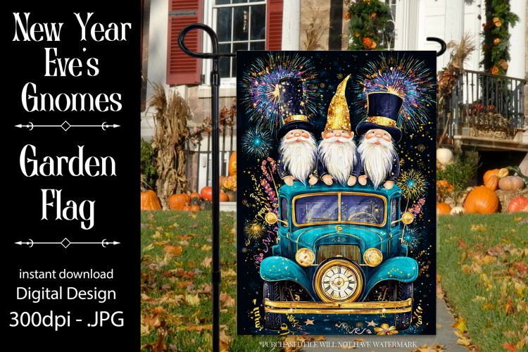 In this listing, you will find a unique new year's eve gnome digital background for a 12x18 garden flag. This flag design is perfect for sublimating on garden flag blanks. This design is sure to add a touch of gnome style to any garden.