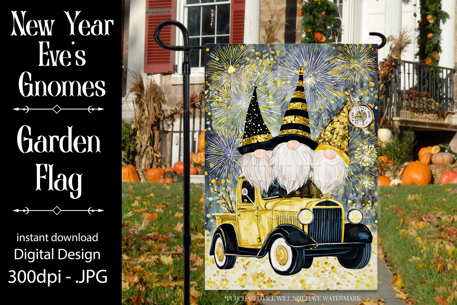 In this listing, you will find a unique new year's eve gnome digital background for a 12x18 garden flag. This flag design is perfect for sublimating on garden flag blanks. This design is sure to add a touch of gnome style to any garden.