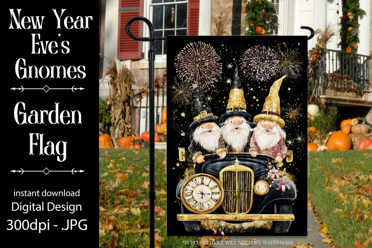 In this listing, you will find a unique new year's eve gnome digital background for a 12x18 garden flag. This flag design is perfect for sublimating on garden flag blanks. This design is sure to add a touch of gnome style to any garden.