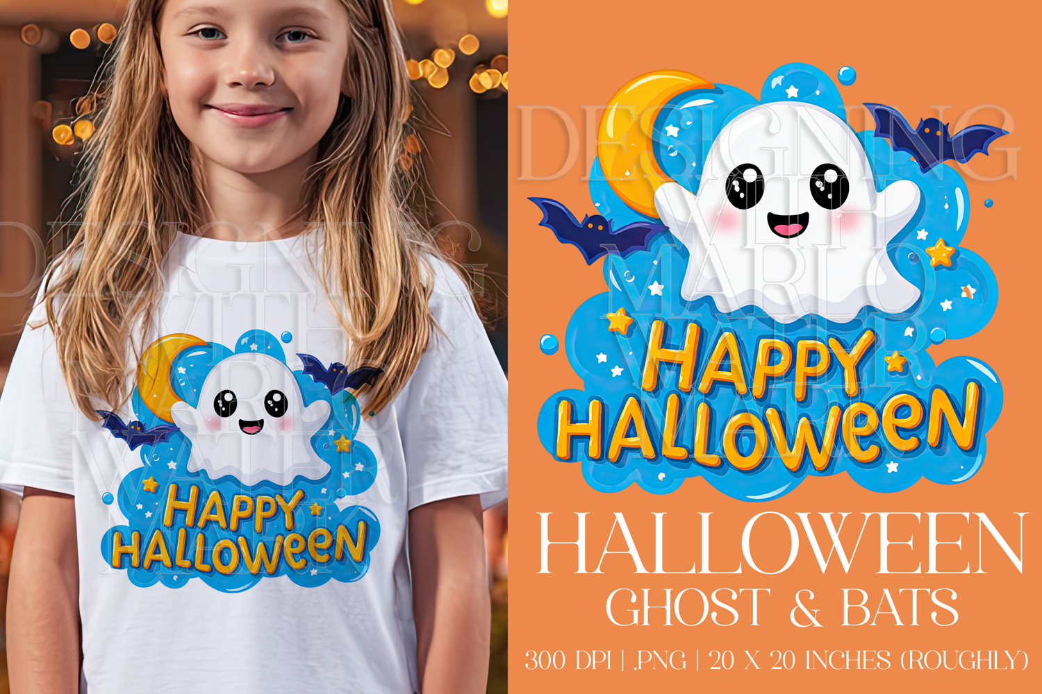 Happy Halloween Graphic, Halloween PNG,Ghost and Bats, g5