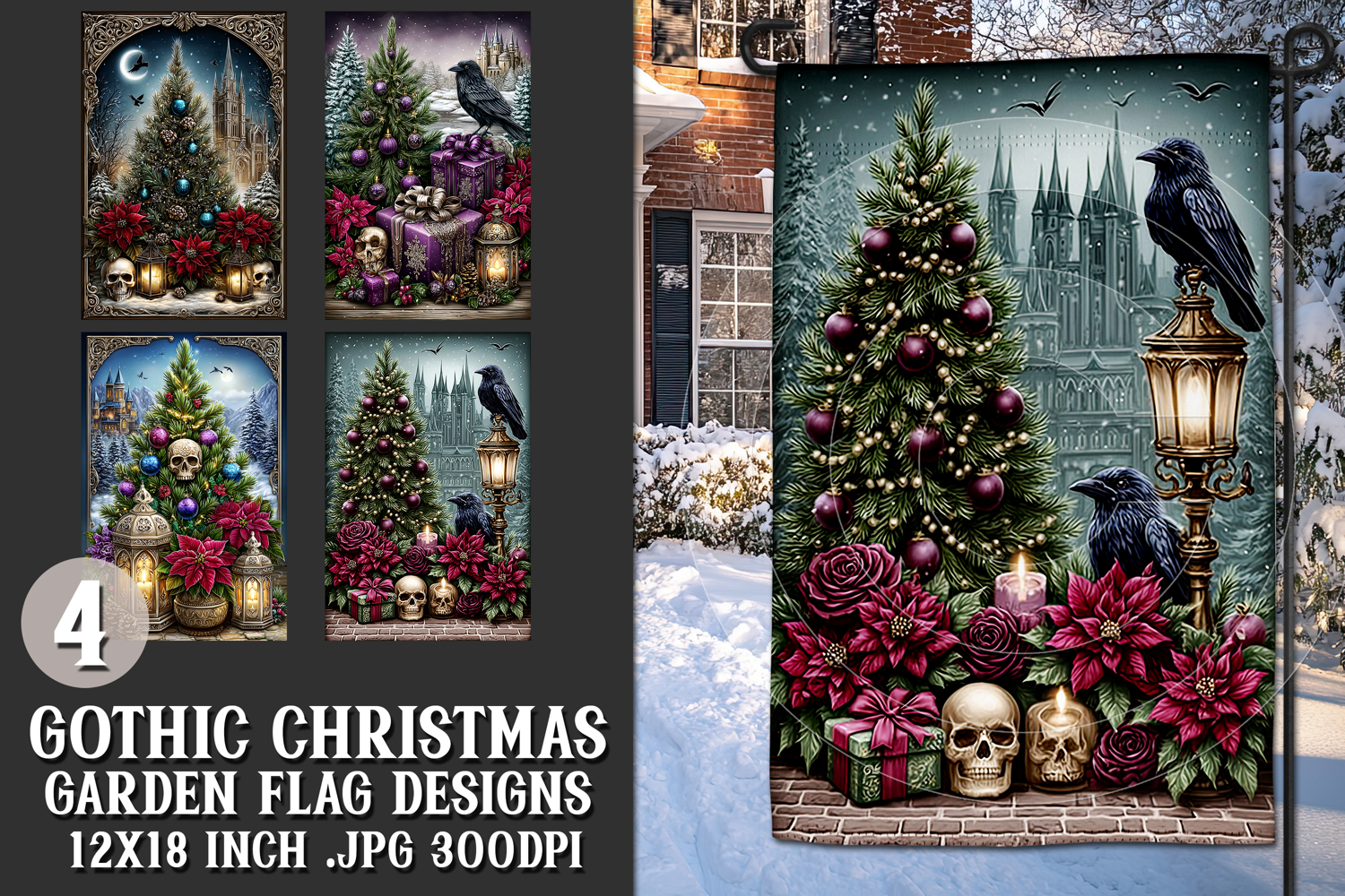 In this listing, you will find a unique gothic christmas digital background for a 12x18 garden flag. This flag design is perfect for sublimating on garden flag blanks. This design is sure to add a touch of holidays style to any garden.