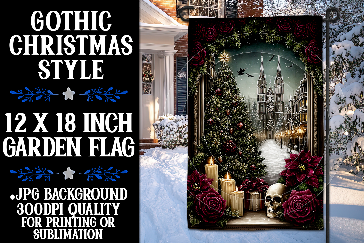 In this listing, you will find a unique gothic christmas digital background for a 12x18 garden flag. This flag design is perfect for sublimating on garden flag blanks. This design is sure to add a touch of holidays style to any garden.