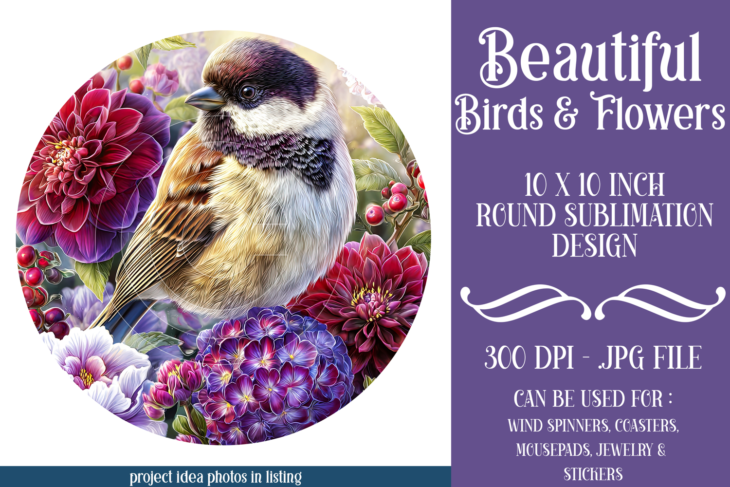 • 1 unique pretty birds and flowers round sublimation design