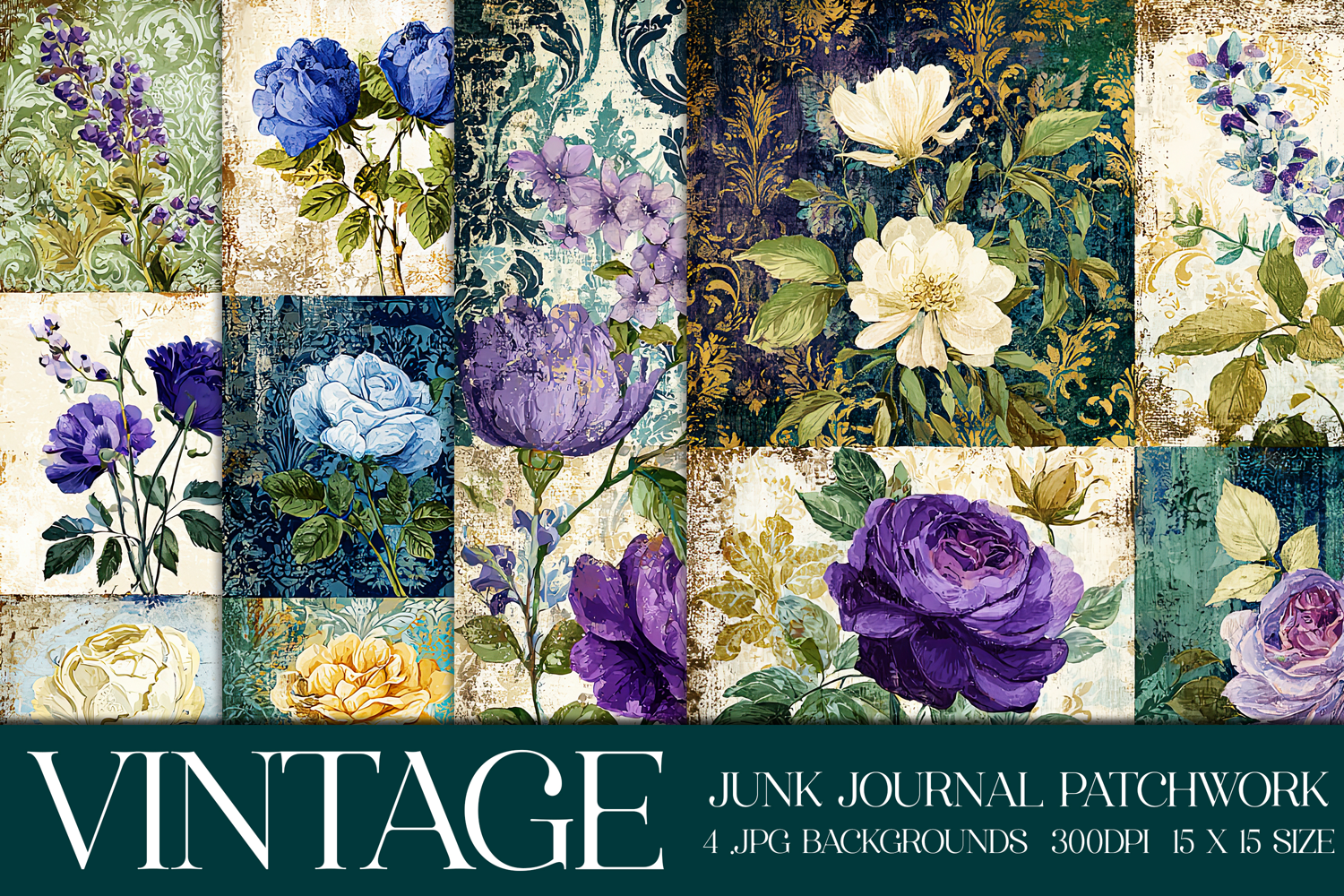 Introducing a unique package of vintage floral patchwork backgrounds for your printing or digital crafts. This package includes beautiful messy junk journal style backgrounds. These print beautifully. And they create a beautiful background to use for your digital or web design projects.