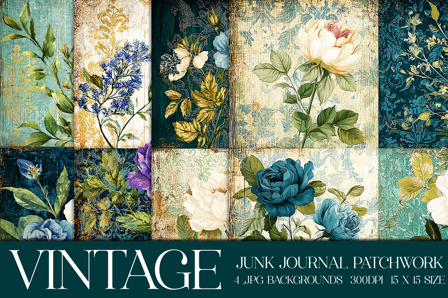 Introducing a unique package of vintage floral patchwork backgrounds for your printing or digital crafts. This package includes beautiful messy junk journal style backgrounds. These print beautifully. And they create a beautiful background to use for your digital or web design projects.