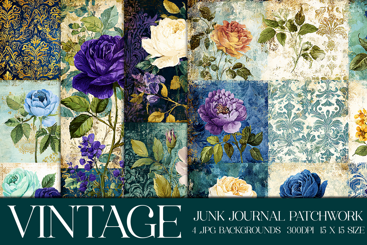 Introducing a unique package of vintage floral patchwork backgrounds for your printing or digital crafts. This package includes beautiful messy junk journal style backgrounds. These print beautifully. And they create a beautiful background to use for your digital or web design projects.