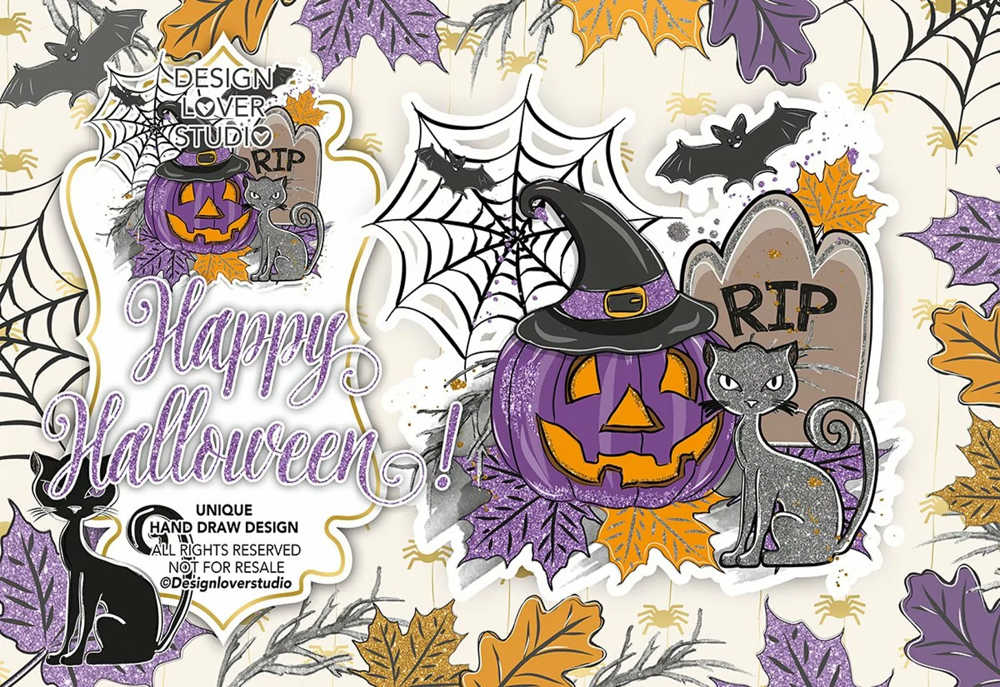 ? Hand Draw "Happy Halloween" and painted clip arts, pumpkin, halloween, spider, leaves, hand painted design