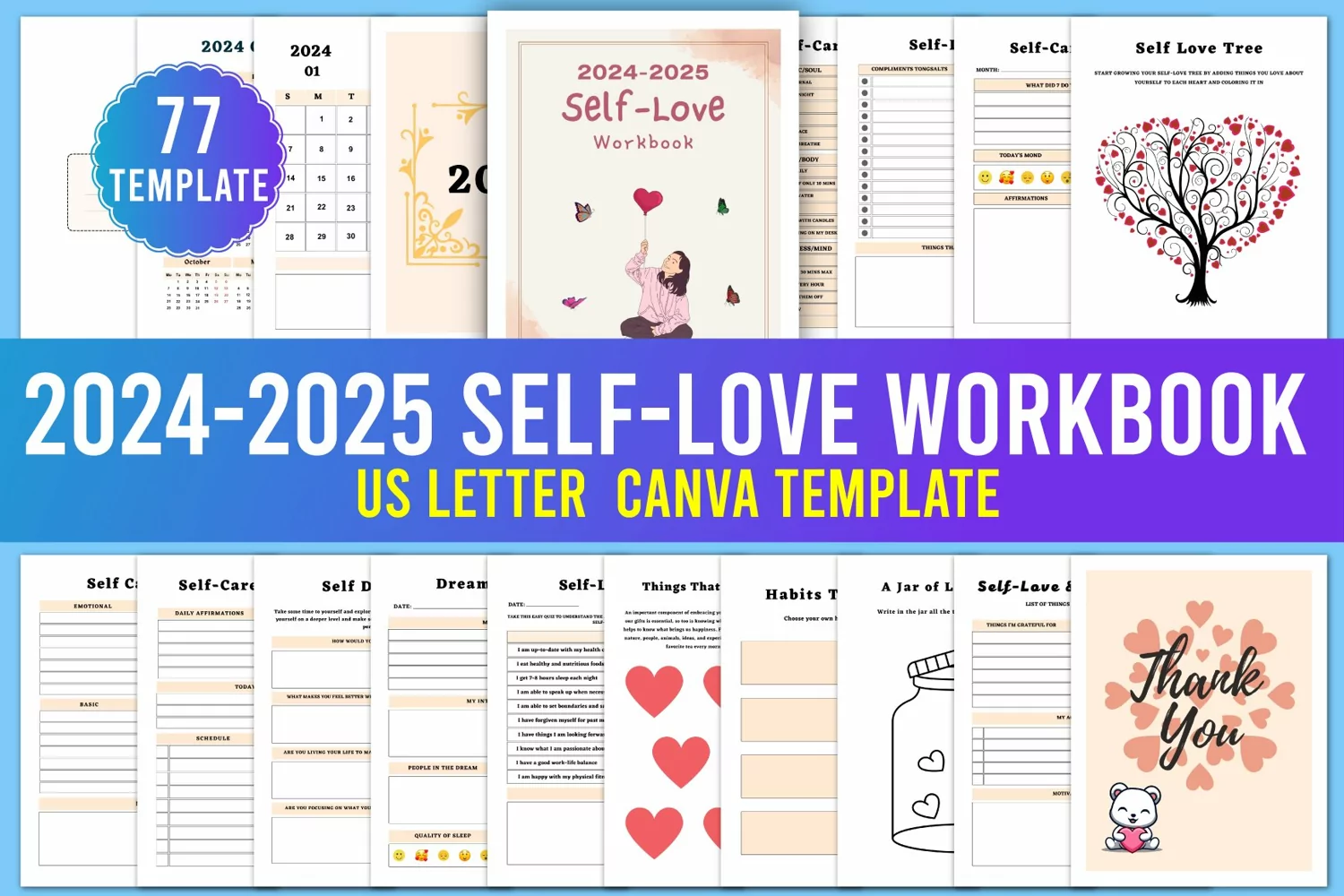 Editable 2024-2025 Self-Love Workbook Canva Interior, You will get a high-quality 2024-2025 Self-Love Workbook for your custom use,