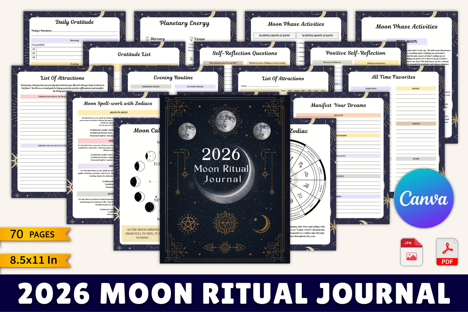 This beautifully designed 2026 Moon Ritual Journal is the perfect companion for spiritual seekers, astrology lovers, and anyone who wants to live more mindfully with lunar cycles. With guided pages, moon calendars, ritual worksheets, and self-reflection prompts, this journal helps you harness moon energy to set intentions, release negativity, and manifest your dreams throughout the year.