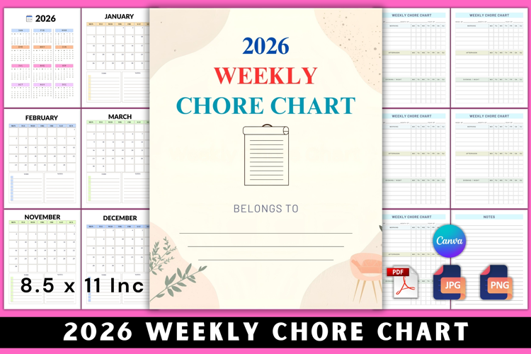 📅 Full 2026 Calendar + Weekly Chore Pages – Plan chores throughout the entire year with ease.
